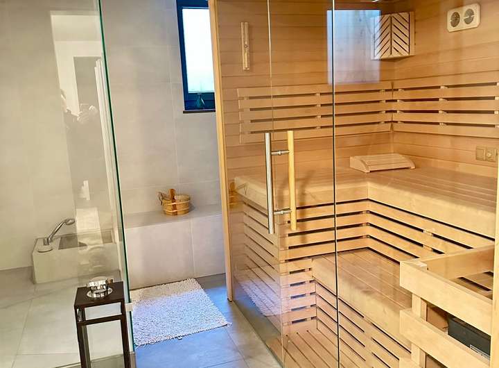 Im Untergeschoss erwartet Sie ein privater Spa-Bereich mit Sauna, Ruhezone und Minibar. Ein modernes Fitnessstudio mit Laufband und Hantelbank sowie ein Heimkino – sowohl hier als auch im Wohnzimmer – bieten zusätzlichen Komfort und Freizeitwert.