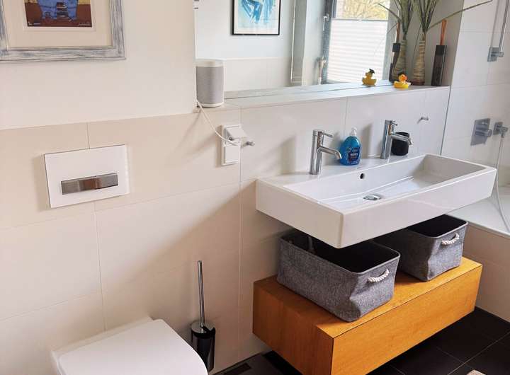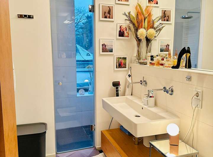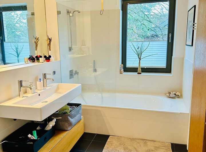 Waschmaschine, Trockner und viel Stauraum sind selbstverständlich vorhanden. Direkt vor dem Haus stehen ein eigener Parkplatz mit Wallbox und Solarmodulen zur Verfügung. Eine Alarmanlage und Außenkameras sorgen für ein sicheres Gefühl rund um die Uhr.
