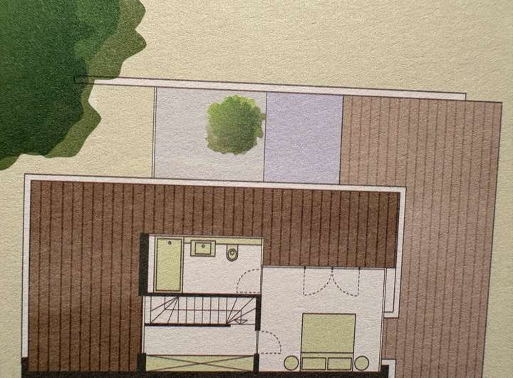 Das Haus verfügt über zwei Schlafzimmer, jeweils mit eigenem Bad, sowie ein weiteres Zimmer, das aktuell als Arbeitszimmer mit Bibliothek genutzt wird. Es lässt sich flexibel als Gästezimmer oder zusätzliches Kinderzimmer einrichten. Eine großzügige Sonnenterrasse mit Blick auf Garten und Teich ergänzt das Raumangebot.