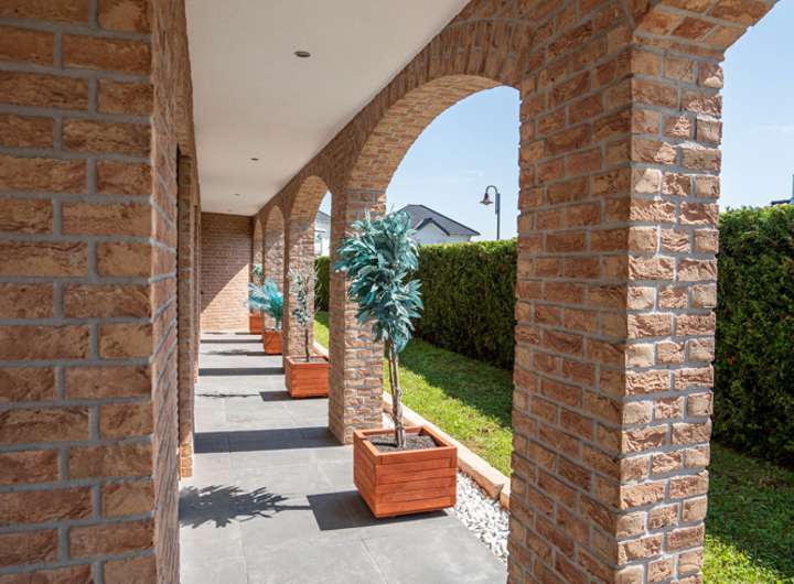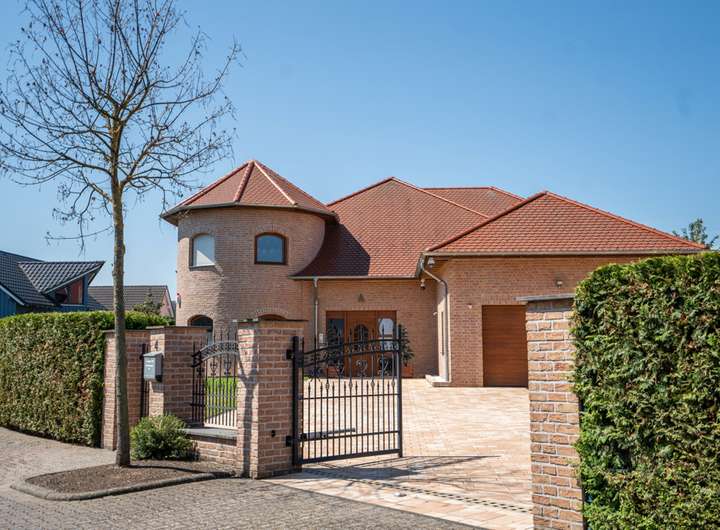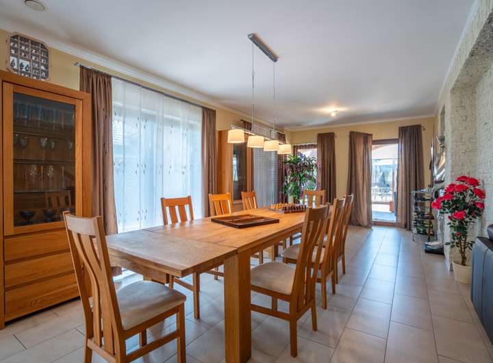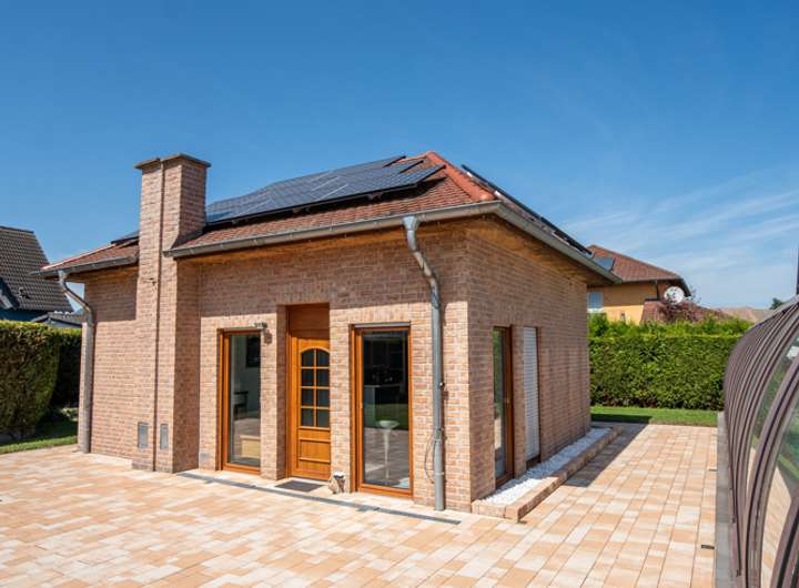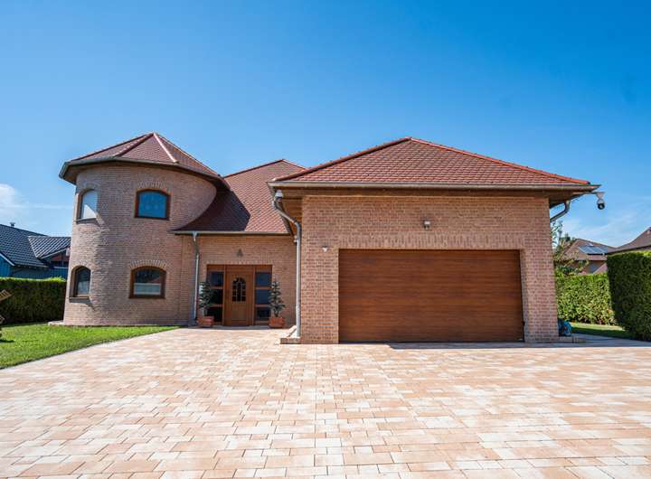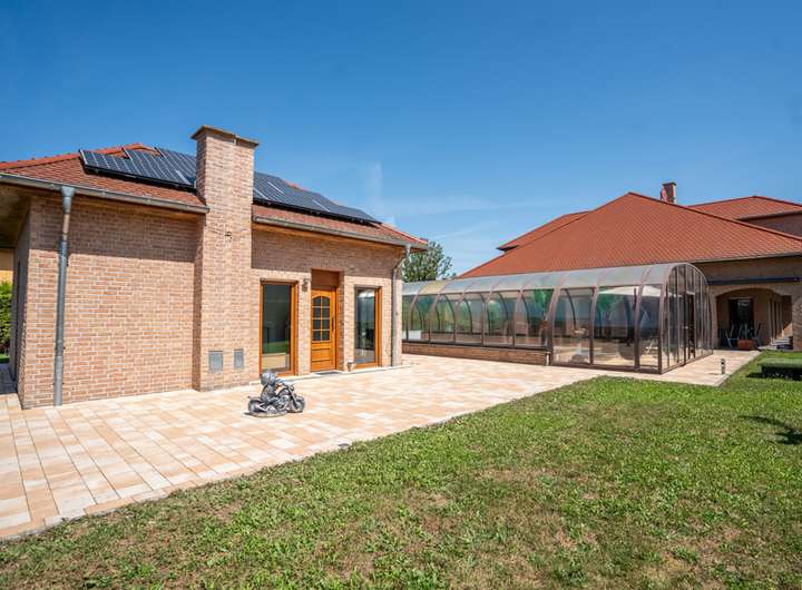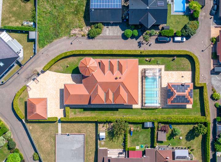 Der Gebäudekomplex besteht aus dem großzügigen Wohnhaus über zwei Etagen sowie zwei Doppelgaragen und dem massiv errichteten Poolhaus.