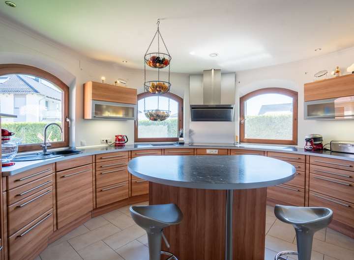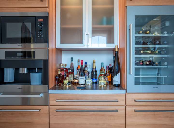 maßgefertigte, hochwertige Markeneinbauküche im Erdgeschoss des "Turmes" und genießen einen nahezu "Rundumblick", während Sie hier Kochabende mit Ihrer Familie und Freunden verbringen. Für den Aperitif schließt sich hier im Durchgang zum Esszimmer eine kleine Getränkeküche mit Weinklimaschrank und Kaffeeautomat an.
