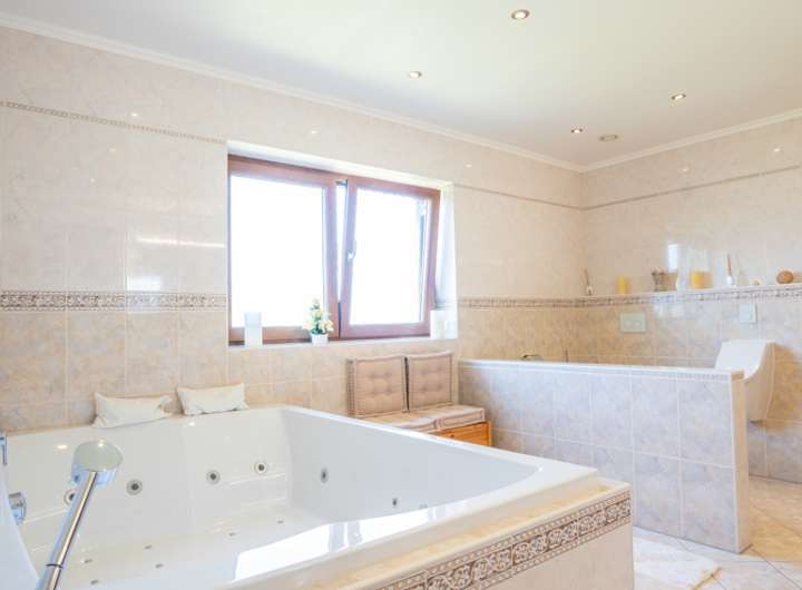 Das Obergeschoss wartet darauf, neue Bewohner im großzügigen Master-Schlafzimmer mit direkt angrenzendem Bad en Suite mit Whirlpool, großem TV und eigenem Duschraum zu begrüßen.