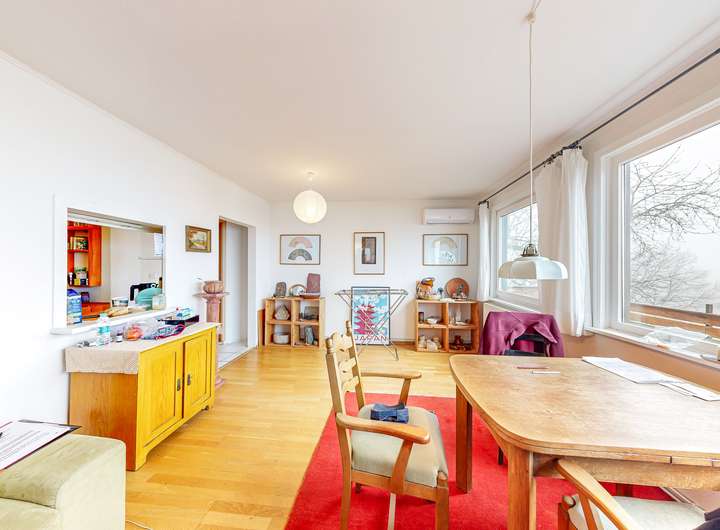 Ein langer Flur führt Sie weiter ins gepflegte Badezimmer und anschließend in die gut ausgestattete Küche, die über eine praktische Durchreiche zum Essbereich verfügt. So können Sie beim Kochen mit Ihren Gästen im Esszimmer in Kontakt bleiben und die großzügigen, offenen Räume genießen.