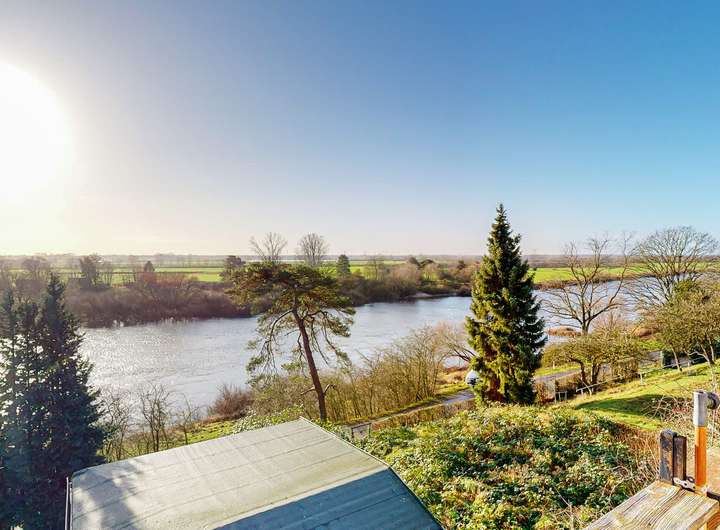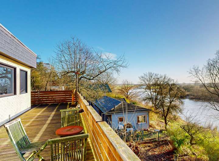 Vom Wintergarten aus betreten Sie das großzügige Wohn- und Esszimmer, das mit seinen großen Fensterfronten zur Weser hin beeindruckt. Der Blick auf das Wasser und die umliegende Landschaft ist einfach atemberaubend – ein idealer Ort für gemütliche Stunden und gesellige Zusammenkünfte. Die offene Gestaltung des Raumes verstärkt das Gefühl von Weite und Licht.