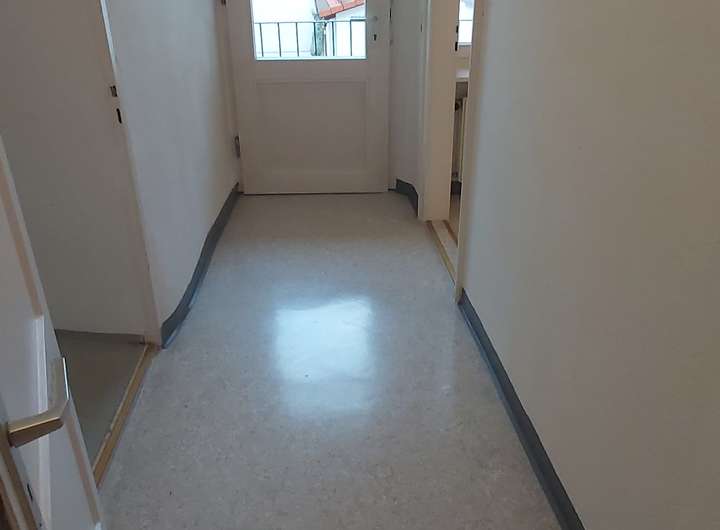 Die Fußböden sind mit PVC-Böden und Fliesen belegt.