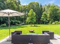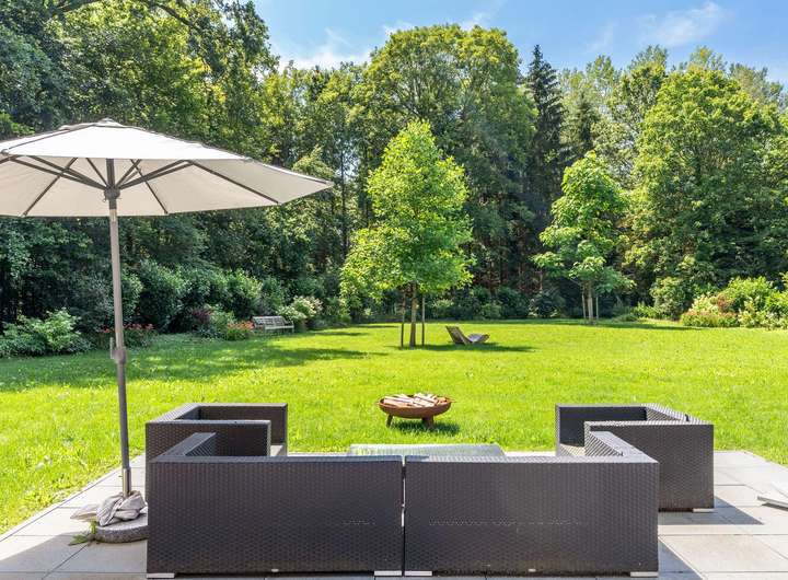 Die Küche in Kupferoptik ist ein besonderer Hingucker. Über den Wohnbereich mit Kamin erreicht man die große Terrasse, über welche man den Blick in den parkähnlichen Garten bis zum Wald schweifen lassen kann.