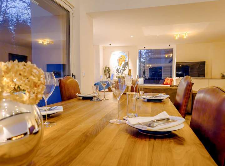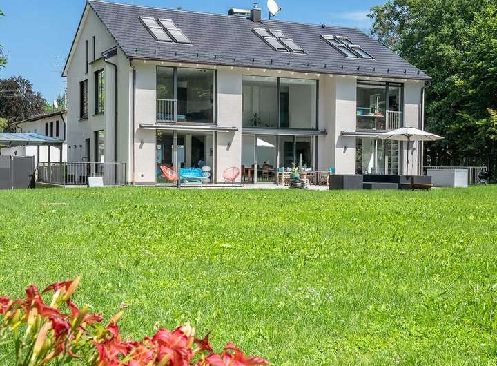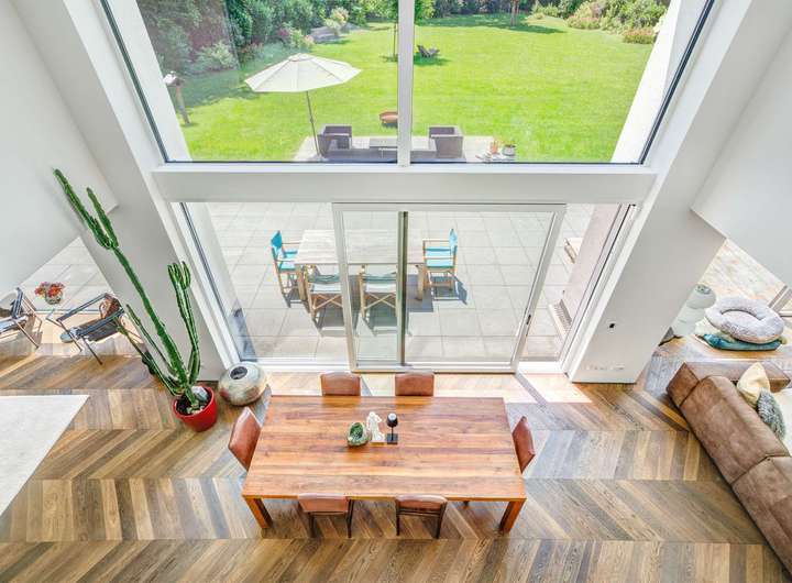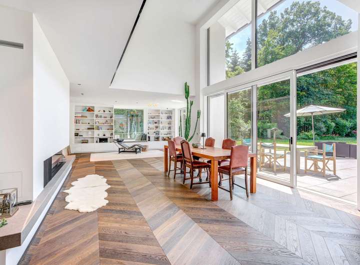 Zahlreiche Schlafzimmer und Bäder aber insbesondere das weitläufig und offen gestaltete Erdgeschoss vereinen repräsentatives Wohnen mit einen pragmatischen Grundriss.