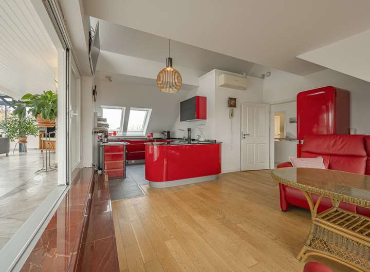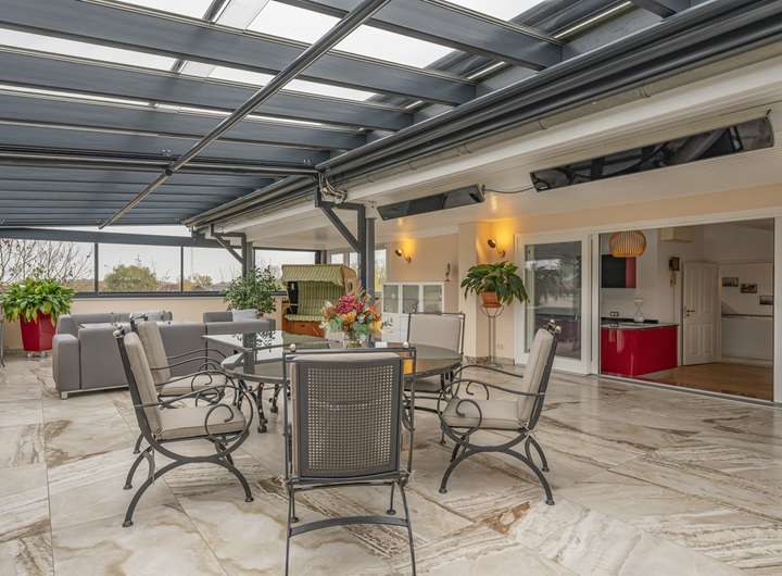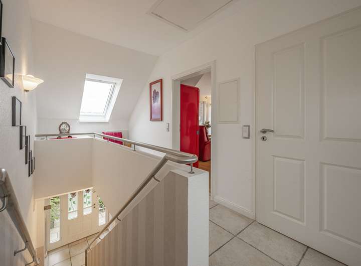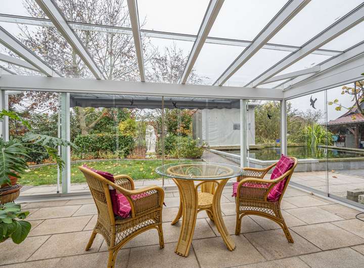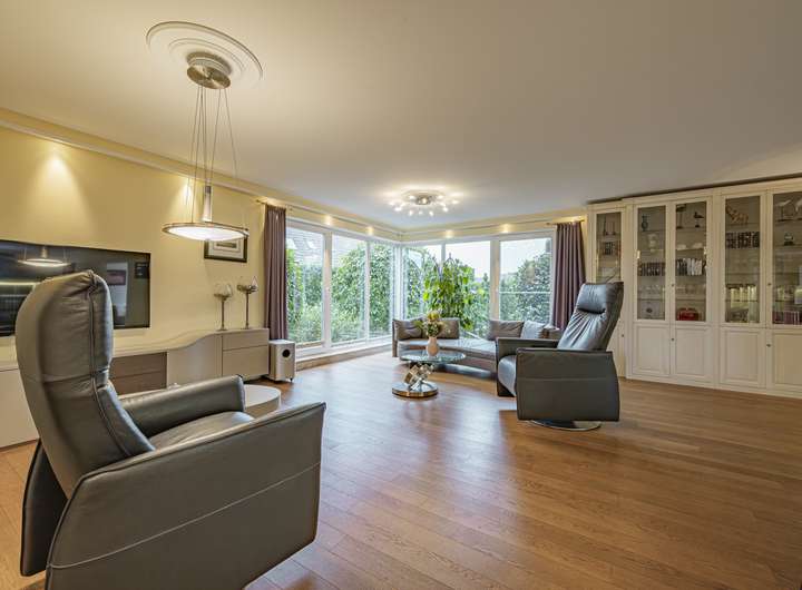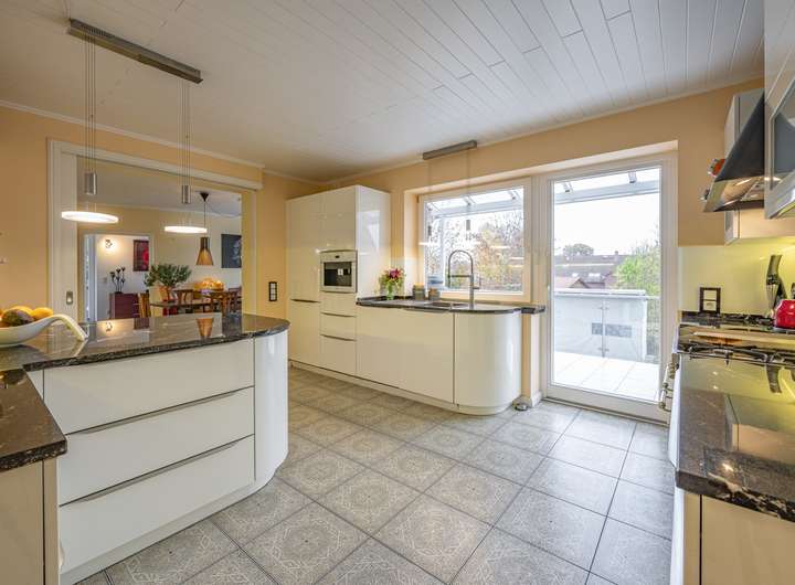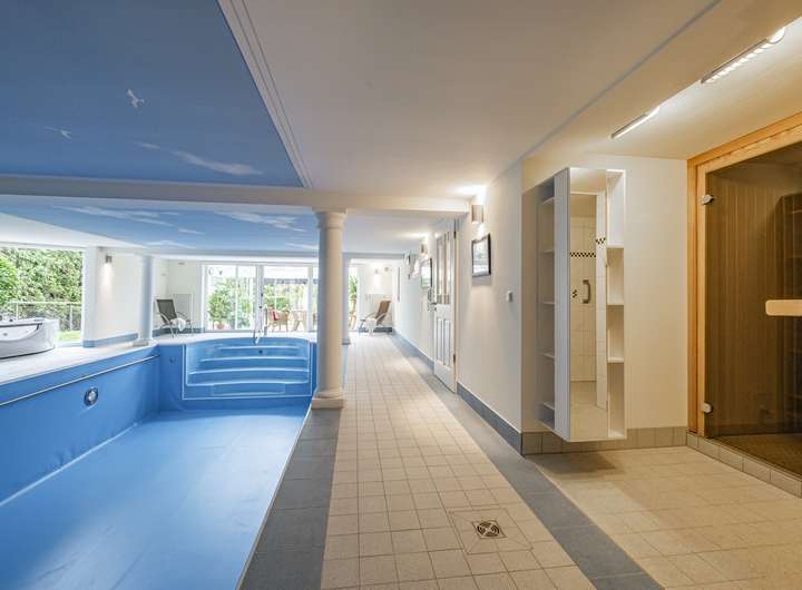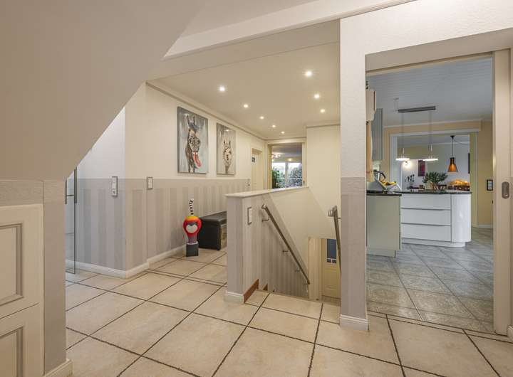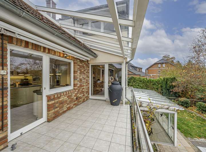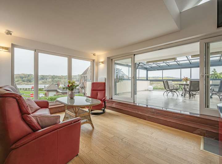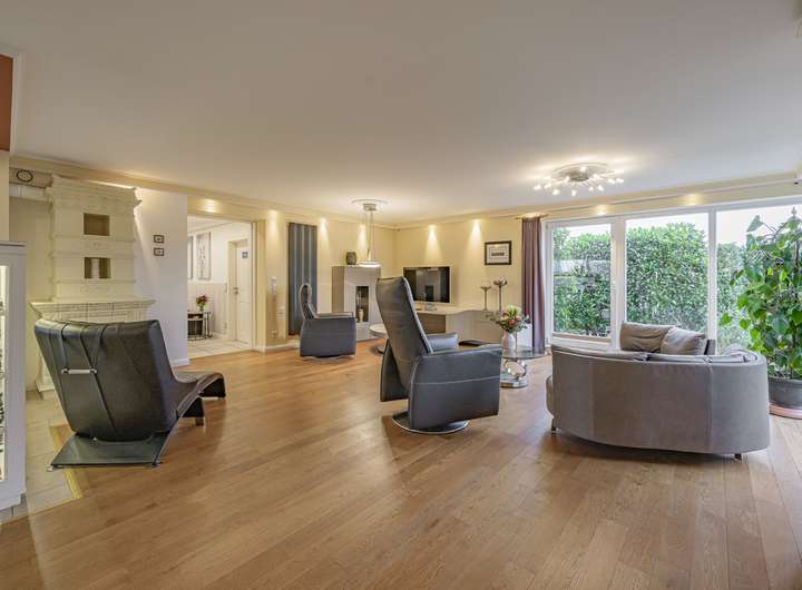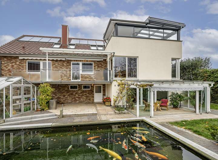 Die großzügigen, ca. 220 m² Wohnfläche der Immobilie begehen Sie durch einen Windfang, welcher in das ca. 158 m² große, lichtdurchflutete Erdgeschoss führt. Der ca. 62 m² große Wohn- und Essbereich geht in die helle, ca. 18 m² große, offen gestaltete Küche über, von der Sie einen direkten Zugang zum nach Süden ausgerichteten Balkon haben. Von hier genießen Sie den Blick in den Garten und auf den Koiteich. Ein ca. 12 m² großes Arbeitszimmer, das ca. 15 m² große Schlafzimmer mit einem Ankleidebereich, einem Bad en Suite und einer Walk-In Dusche, runden das Raumkonzept im Erdgeschoss ab. Das Dachgeschoss beherbergt ein Schlafzimmer, ein Duschbad und einen offenen Wohn- und Essbereich, welcher durch eine Designerküche komplettiert wird. Ein besonderes Highlight ist der ca. 68 m² große Wintergarten, der als Nutzfläche berechnet wird. Von hier genießen Sie einen einmaligen Blick auf die Elbe. Für zusätzliche Auszeiten sorgt der Wellnessbereich, welcher mit einem ca. 82 m² großen Schwimmbad mit Gegenstromanlage, einer Whirlpool-Badewanne, einer Sauna, einer Dusche sowie einem Dusch-WC ausgestattet ist. Im angrenzenden Wintergarten können Sie relaxen und den Garten begehen.
