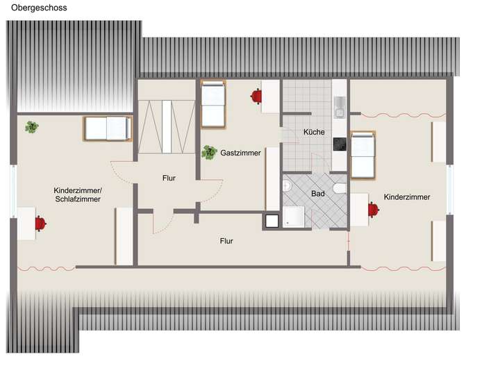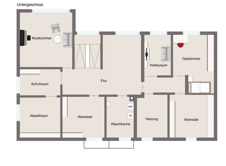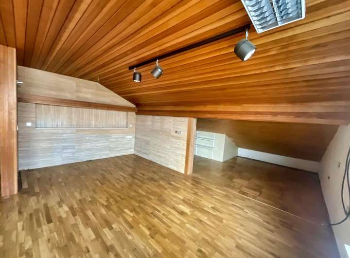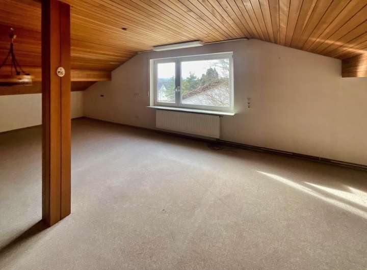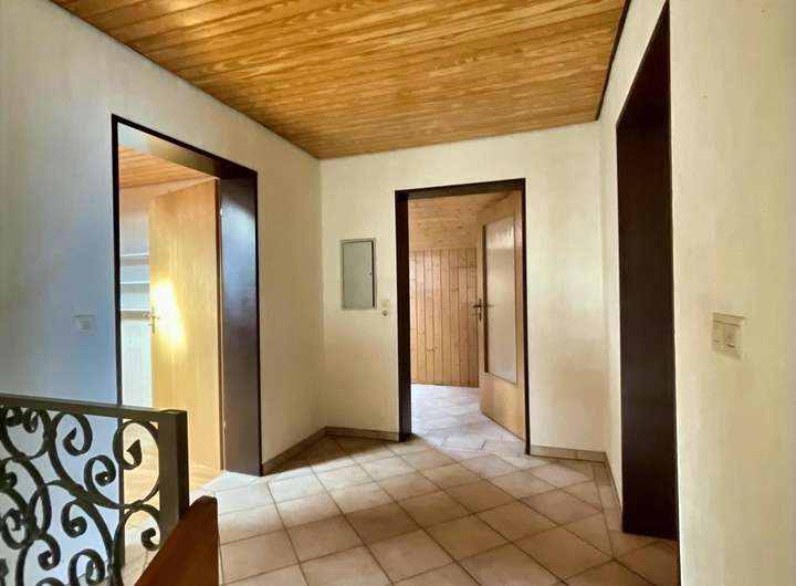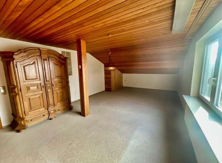 Das Obergeschoss bietet mit zwei sehr geräumigen Kinderzimmern, einem Gästezimmer, einer Küche und einem Bad genügend Platz für eine Familie. Im Untergeschoss stehen weitere Räume zur Verfügung, welche genügend Raum für eine freie Entfaltung bieten. Ein Zugang zur uneinsichtigen Terrasse und ein weitläufiger Garten runden das einmalige Angebot ab. Zwei Garagen sind ebenfalls vorhanden.