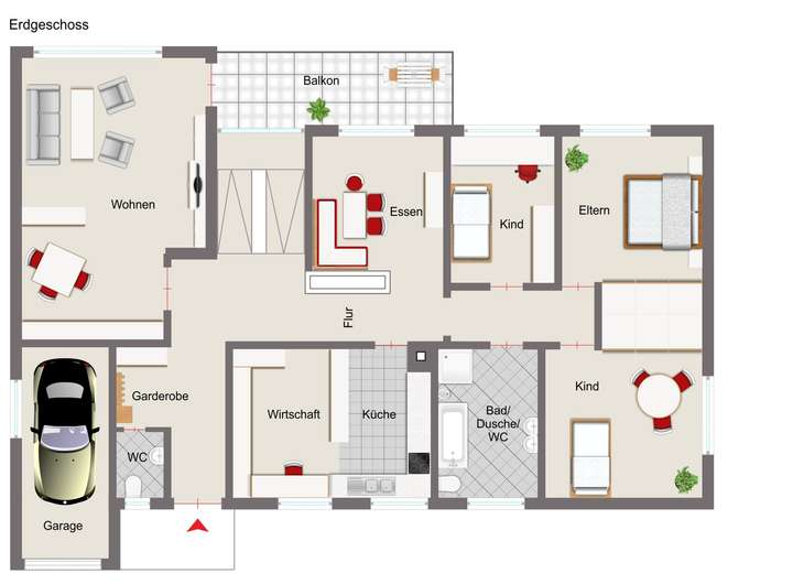 Das lichtdurchflutete Erdgeschoss umfasst ein geräumiges Wohnzimmer mit Zugang zum Balkon, einen offenen Essbereich, eine Küche mit angrenzendem Wirtschaftsraum, drei Schlafzimmer und zwei Bäder mit separatem Gäste-WC.