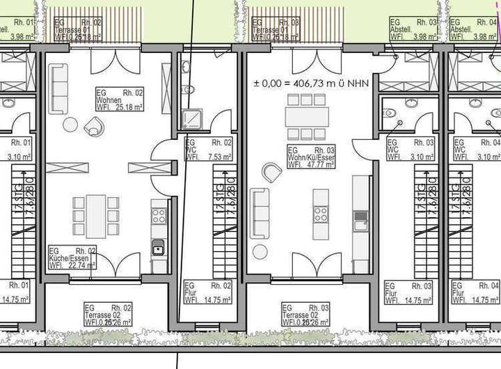 Die geplanten Reihenhäuser verfügen über einen nahezu ähnlichen Grundriss und sind optimal für Familien, Paare oder als attraktive Kapitalanlage geeignet. Der Zugang zu jedem Haus erfolgt bequem über das Untergeschoss. Im Erdgeschoss befindet sich der großzügige Wohn- und Essbereich mit einer modernen offenen Gestaltung sowie einer separaten Toilette. Von hier aus gelangen Sie auf die Terrasse, die zum Verweilen einlädt, sowie auf eine mögliche zweite, höher gelegene Terrasse mit angrenzendem Gartenbereich im Hang.