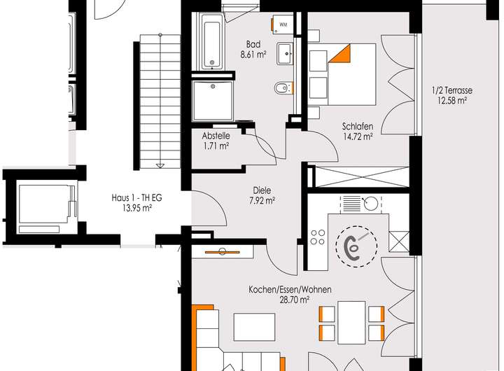 Wohnen-Essen-Kochen lässt sich auf ca. 29 qm Wohnfläche ideal gestalten.