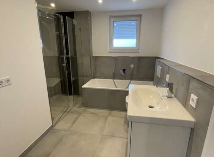 Eine begehbare Dusche befindet sich im großzügigen Bad welches großzügig und modern gefliest wurde.