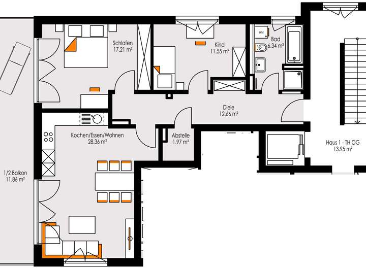 Der Zugang zum großzügigen Balkon mit ca. 24 qm! ist sowohl vom Essbereich als auch vom Schlafzimmer aus möglich. Aufgrund der Hanglage verfügt diese Wohnung über einen sehr schönen Balkon mit toller Aussicht.