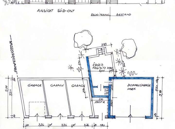 5 Garagen (in 1988 erbaut), 4 Pkw-Stellplätze