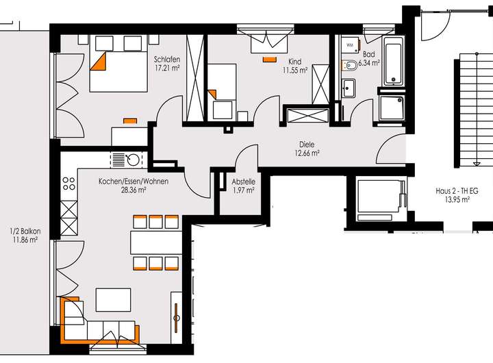 Wohnen-Essen-Kochen lässt sich auf ca. 28 qm Wohnfläche ideal gestalten.