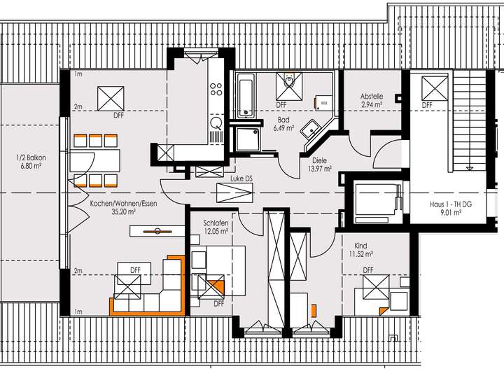 Wohnen-Essen-Kochen lässt sich auf ca. 35 qm Wohnfläche ideal gestalten.