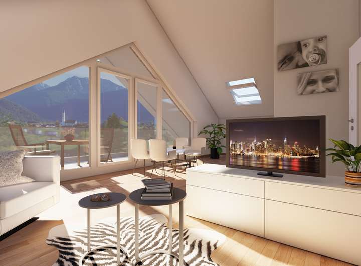 Eine großflächige Verglasung bis in den Giebel ist der absolute Traum dieser herrlichen Dachwohnung. Romantik pur bietet der große Balkon mit Sonnenuntergangblick.