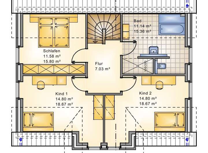 Basierend auf der Grundform eines Satteldachhauses wird bei diesem Haustyp ein massiv hervorspringender Giebel hinzugefügt. Durch seinen Versatz entsteht im Erdgeschoss eine Art Erker und im Obergeschoss wird ein Bereich des Hauptdaches durchbrochen und es entsteht ein Raum ohne Dachschrägen. Der Nutzen ist vielseitig: vom großzügigen Eingangsbereich mit einer offenen Galerie bis hin zu einem gemütlichen Erker für den Esstisch und einem zusätzlichen Arbeitszimmer ist alles individuell planbar.