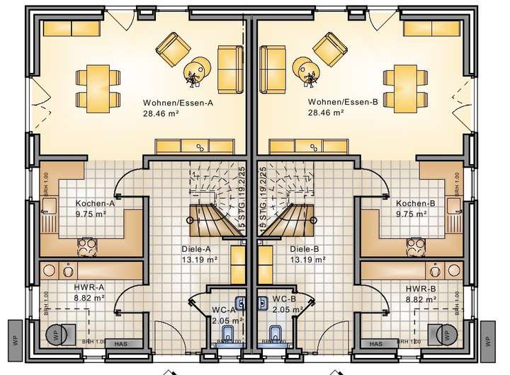 Bei dem AMR- Doppelhaus steht optimale Flächennutzung, sowie großzügiger Wohnkomfort im Vordergrund. Sie eignen sich ideal für die Bebauung kleiner Grundstücke und ermöglichen eine kostengünstige Ausnutzung Ihres wertvollen Baugrundstücks.