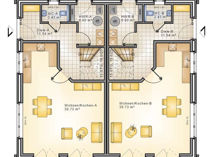 Bei dem AMR- Doppelhaus steht optimale Flächennutzung, sowie großzügiger Wohnkomfort im Vordergrund. Sie eignen sich ideal für die Bebauung kleiner Grundstücke und ermöglichen eine kostengünstige Ausnutzung Ihres wertvollen Baugrundstücks.