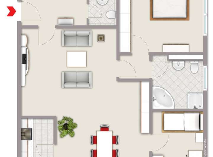 Aufgeteilt ist die Wohnung in einem großzügigen Wohn- u. Essbereich mit Zugang zur Terrasse, zwei möglichen Schlafzimmern, einer Küche, einem Tageslichtbad und einem Gäste-WC. Die Wohnung hat eine Größe von ca. 91 m² Wohnfläche.