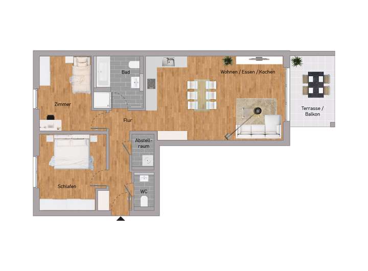Der Flur mit ca. 11 m² verbindet alle Räume optimal und schafft ein angenehmes Wohngefühl. Ein Abstellraum (ca. 3,7 m²) sorgt für praktischen Stauraum, um Ihre Wohnung jederzeit aufgeräumt zu halten.