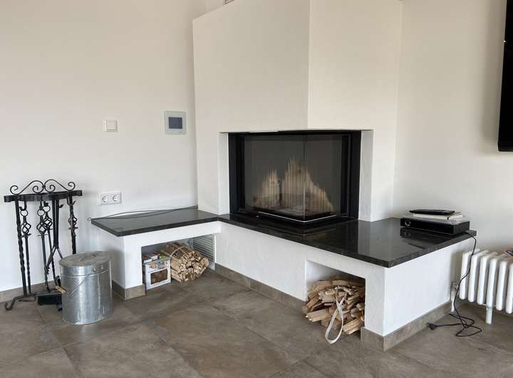 Heizungsunterstützender Brunner-Kamin mit sichtbaren Feuer.