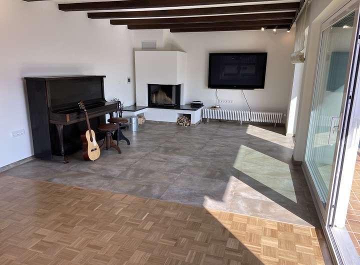Im EG treten Sie über einen großzügigen Entrée für Ihre Garderobe in das große helle Wohnzimmer ein, welches durch große Fensterflächen und einen umlaufenden Balkon besticht. Von dort aus erreichen Sie das benachbarte Kaminzimmer, welches ebenfalls mit großen Fensterflächen und Zugang zur Süd-WestTerrasse ausgestattet ist. In beiden Zimmern liegen Parkettböden, im Bereich des offenen Kamins ist ein harmonischer Natursteinboden verlegt.