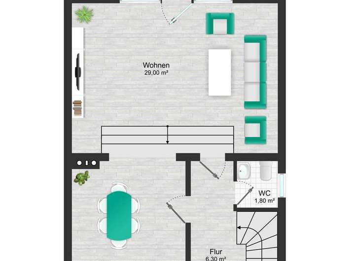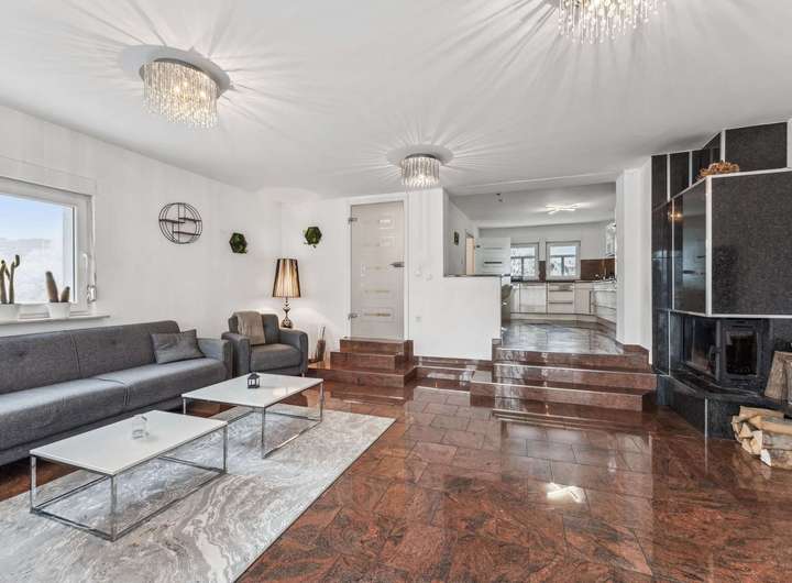 • Erdgeschoss: Küche, Esszimmer und ein gemütliches Wohnzimmer mit Kamin für behagliche Abende, ergänzt durch ein praktisches Gäste-WC.