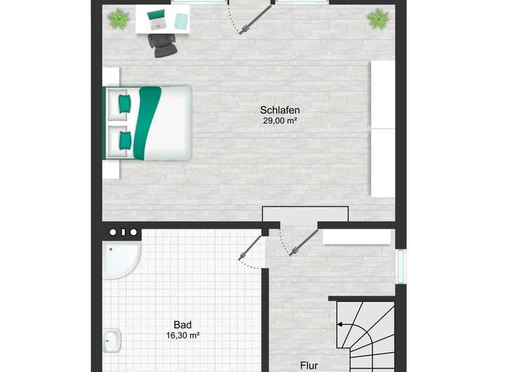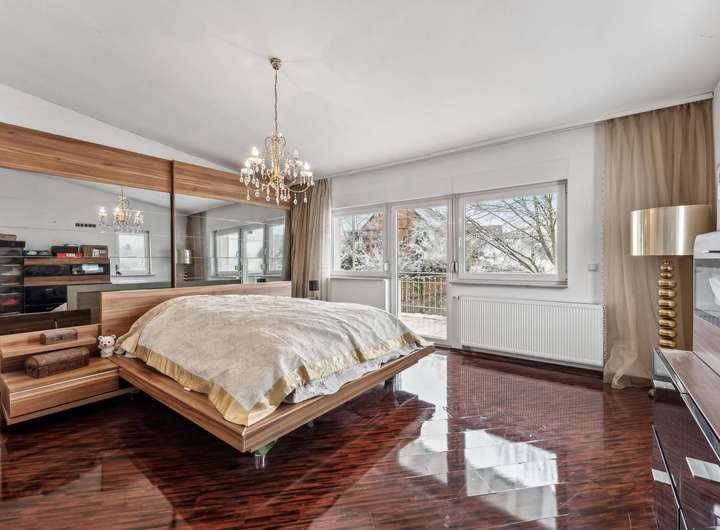 • Obergeschoss: Geräumiges Schlafzimmer mit Zugang zum Balkon, sowie ein modernes Badezimmer.