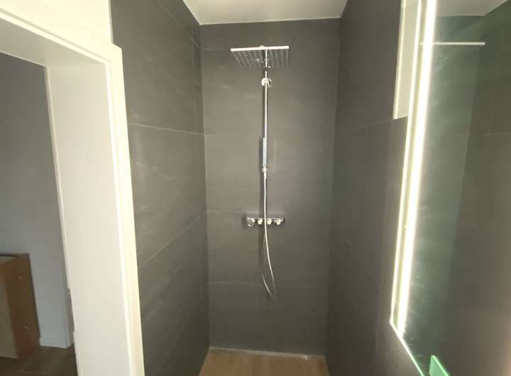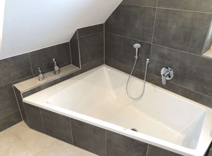 Im Badezimmer gibt es design Badmöbel aus dem Hause Detering mit beheizbarem Spiegel der nicht mehr beschlagen kann.