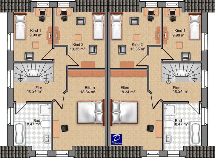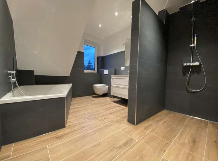 Kommen wir zur Raumaufteilung: Ein großzügiges Wohnzimmer, dass auf Wunsch zum "offen Wohnen" wird, inklusive Küchenbereich. Weiter gibt es drei Schlafzimmer, mit Studioraum im DG sogar vier Schlafzimmer. Weiter ein Duschbad im EG mit Raindancer, ein Vollbad im OG mit Designerbadewanne und gemauerter Dusche und Raindanceranlage wie schon im EG.
