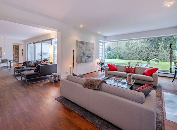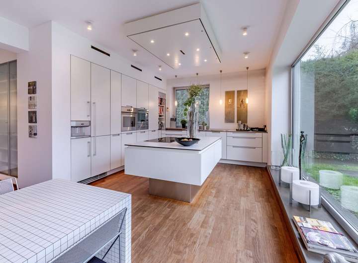 Die Architektenvilla wird über eine Fußboden- und Deckenheizung beheizt, die für ein besonders gutes Raumklima sorgen.