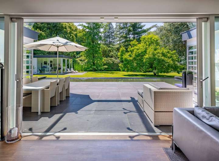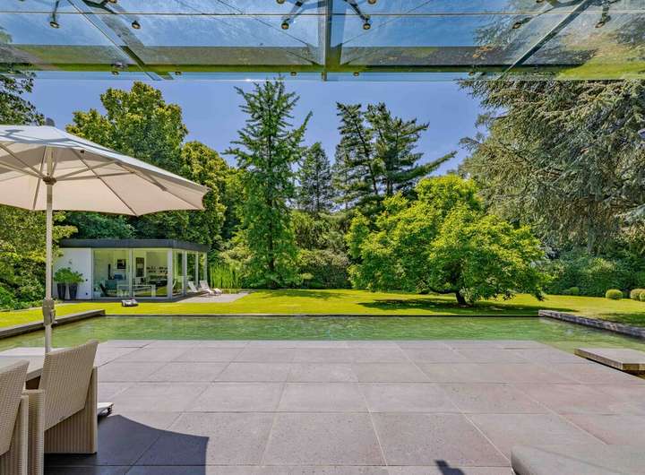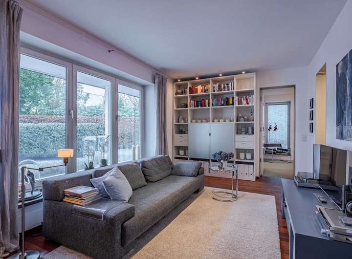 Schon beim Betreten des weiträumigen Wohnbereiches genießt man einen atemberaubenden Blick über die großzügige Terrasse hinweg in den traumhaften Gartenpark.