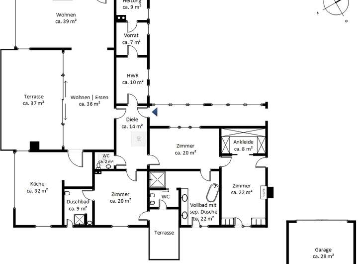 Der eingeschossige Bungalow bietet neben dem offenen Wohnkonzept drei weitere Zimmer sowie zwei Bäder und ein Gäste-WC.