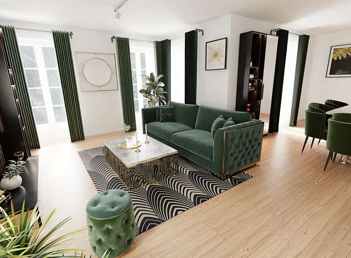 Die Böden im Erdgeschoss sind mit hochwertigem Eichenparkettfußboden gestaltet worden, die ein stilvolles Ambiente schaffen. Die Wohnräume des Obergeschosse sind mit hellem Teppichboden ausgestattet.
