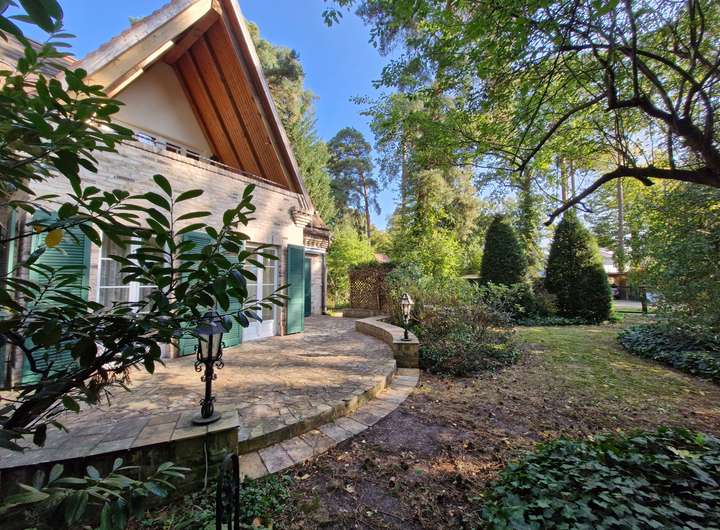 Empfangen von einem zentralen repräsentativen Foyer zweigen die weiteren Räume in die verschiedenen Himmelrichtungen ab. Nach Westen liegt das einladende Gästezimmer, nach Osten das Gäste WC mit bodentiefer Dusche und hübschen Fliesenspiegel (weiß und braun) und nach Süden das weitläufige Wohnzimmer mit angrenzendem praktischen Küchenbereich und dem angegliederten Hauswirtschaftsraum. Hier spart man Wege. Die Küche verfügt über eine Einbauzeile, die mit Ceranherd und Geschirrspüler ausgestattet ist. Ein lichtdurchfluteter Erker und bodentiefe Fensterfronten spiegeln die Natur des Gartens wider. Der Wohnbereich begeistert durch seine Helligkeit und Weitläufigkeit. Hier können Sie nach Herzenslust entspannen. Direkt an das Wohnzimmer schließt sich eine große aus erlesenem Naturstein gearbeitete Terrasse nach Süden und Westen ( ca. 50 m²) an, mit perfektem Blick in den erlesenen blickdichten Garten – der perfekte Ort für wohltuende Stunden im Freien.