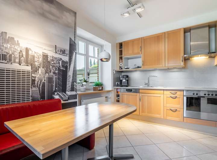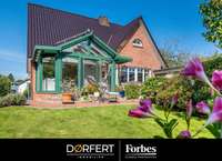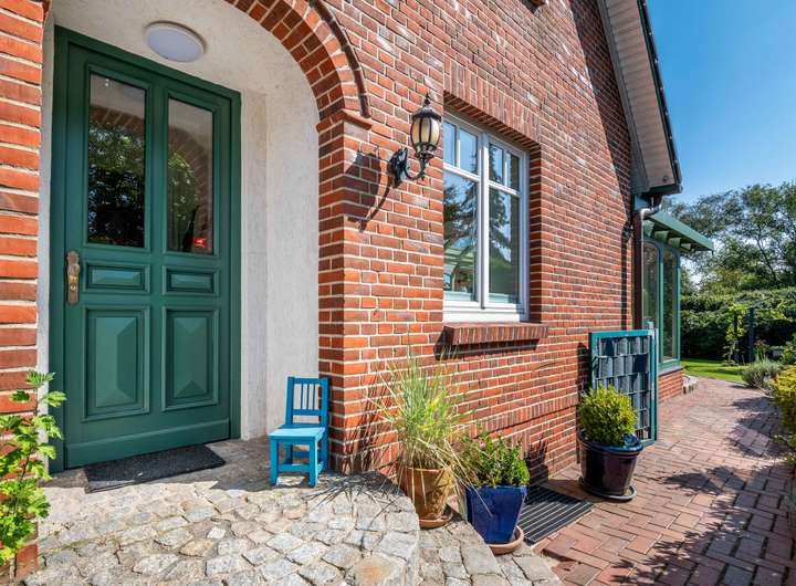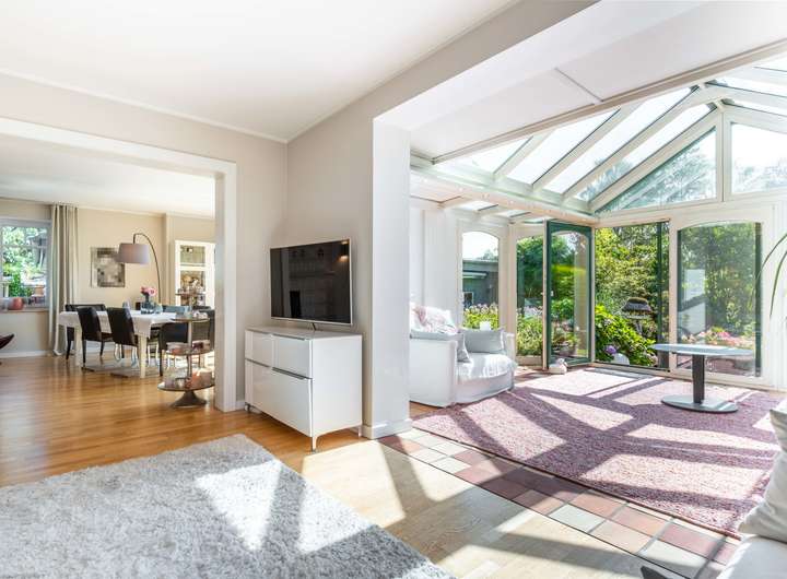 Im Inneren des Hauses trifft man auf moderne Elemente, da das Haus im Jahr 2000 aufwendig modernisiert und seither stets instand gehalten wurde. Ein heller, weitläufiger Flur führt, vorbei an einem Gästebad und einem angrenzenden, individuell nutzbaren Zimmer, in das große, lichtdurchflutete Wohnzimmer mit Wohn-/Essbereich. Dunkle Parkettböden, große Sprossenfenster und ein weißer Kachelofen sowie der angrenzende Wintergarten sorgen für ein edles Wohnambiente. Auch die großzügige Küche lädt zu gemütlichem Beisammensein ein.