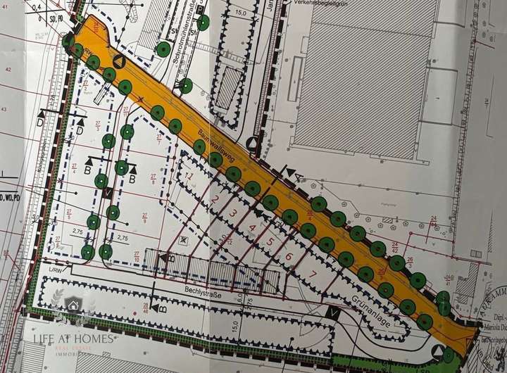 Auf Basis einer Voranfrage wurde von der Stadt bestätigt, dass eine geschlossene Bauweise mit Reihenhäusern und Tiefgarage gemäß Bebauungsplan Nr. 42 (Eschengrund/Gartenbau) möglich ist. Eine Riegelbebauung entlang ist zulässig, vorausgesetzt, an der Grenze zum Grundstück Gerstenstraße wird ebenfalls eine geschlossene Bebauung realisiert. Die bauplanungsrechtliche Zulässigkeit richtet sich nach § 30 BauGB.