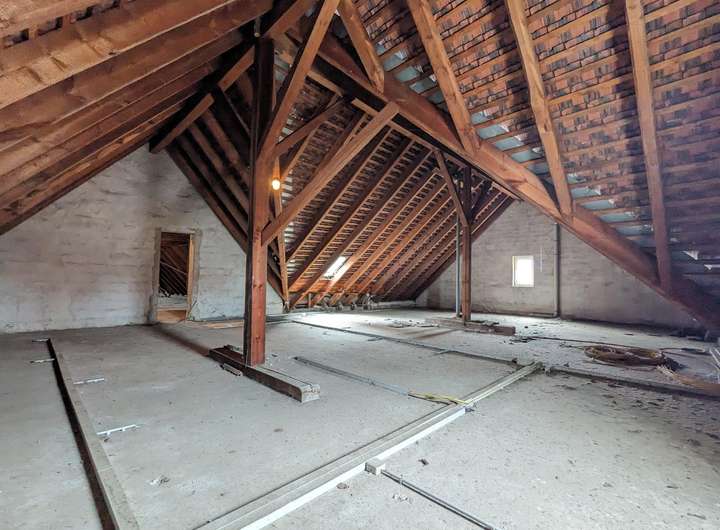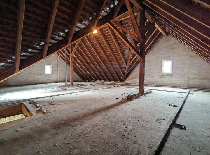 Weiterhin besteht bei diesem Gebäude noch enormes Entwicklungspotenzial. Aufgrund des sehr gut erhaltenen Dachstuhles und der großzügigen Höhe gibt es hier die Möglichkeit, den noch ungenutzten Speicherraum in eine weitere Wohnung zu verwandeln.