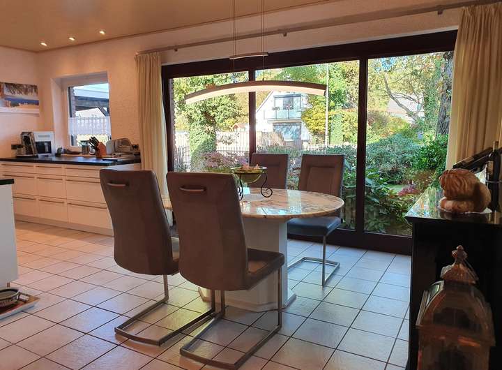 Die große Fensterfront im Essbereich sowie die seitliche im Wohnzimmer sind mit elektrischen und zeitgesteuerten Innenrollos ausgestattet.