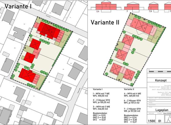 Die Flächenermittlung erfolgt anhand der BGF mit 0.75-Ansatz für den Abzug der Verkehrsflächen, das Konzept ist mit dem Bauamt bereits zumindest vorbesprochen, es stellt im Rahmen der Einfügung in die Umgebung aus Sicht des Architekten ein argumentier- bzw. nachvollziehbares Verdichtungskonzept in Geschossigkeit und Planungsmischung aus kleiner Mehrparteilichkeiten und EFHs in der Tiefe dar, es Bedarf aber der weiteren Abstimmung mit dem Bauamt bzw. einer erweiterten Bauvoranfrage.
