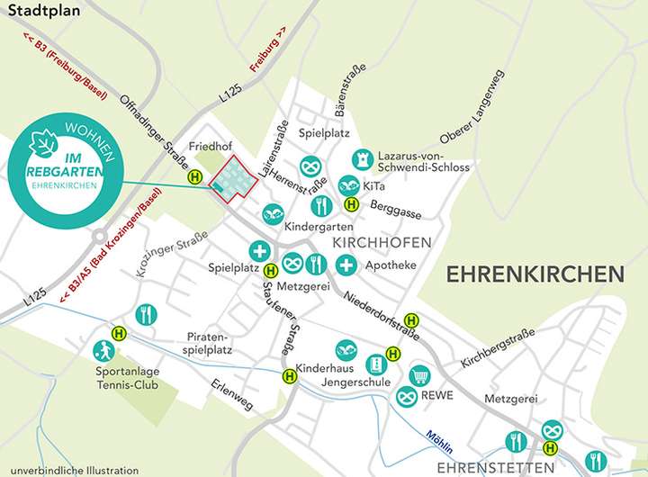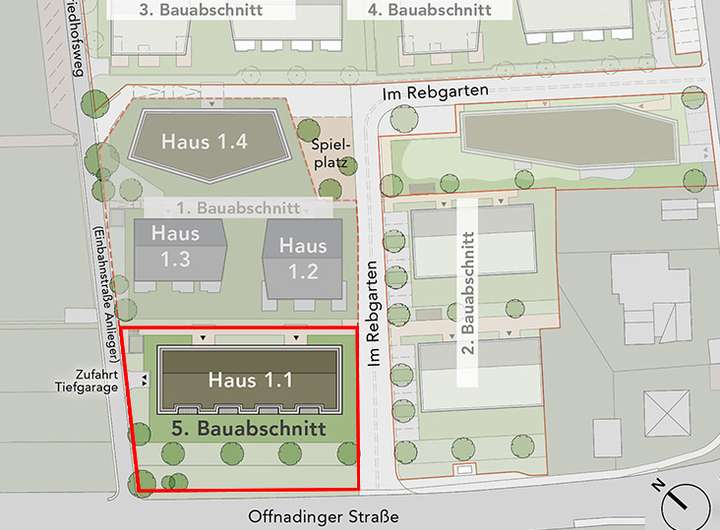 Am westlichen Ortseingang von Kirchhofen, einem Teilort von Ehrenkirchen, entsteht zwischen Offnadinger und Lairenstraße auf ca. 18.000 m² ein neues Wohnareal mit ca. 180 Wohneinheiten in mehreren Bauabschnitten. Für den 5. Bauabschnitt sind 12 förderfähige Neubauwohnungen im Haus 1.1 geplant. Die Wohnungsgrößen variieren zwischen einer Wohnfläche von ca. 59 m² und ca. 75 m², bei 2 oder 3 Zimmern. Sämtliche Wohnungen sind gemäß den Programmen der Mietwohnungsfinanzierung BW der L-Bank Baden-Württemberg förderfähig.