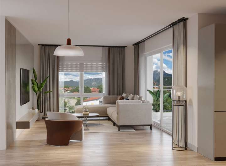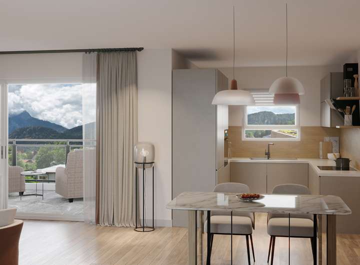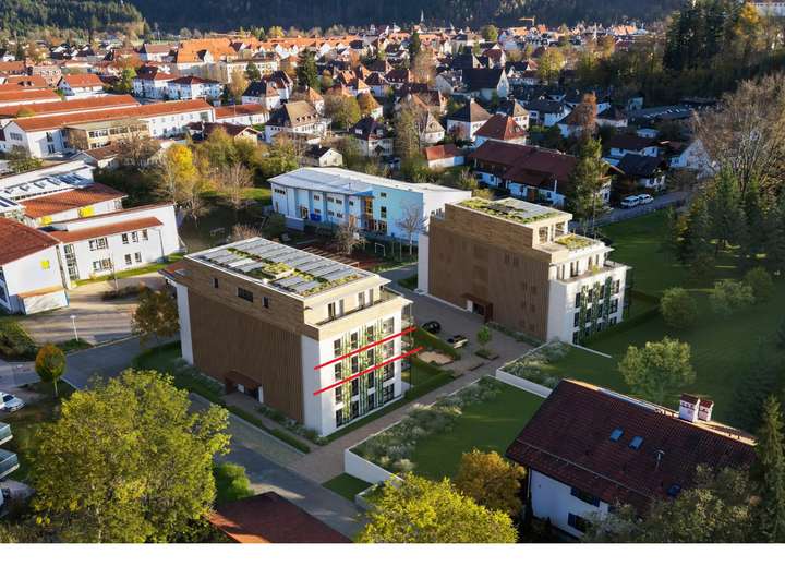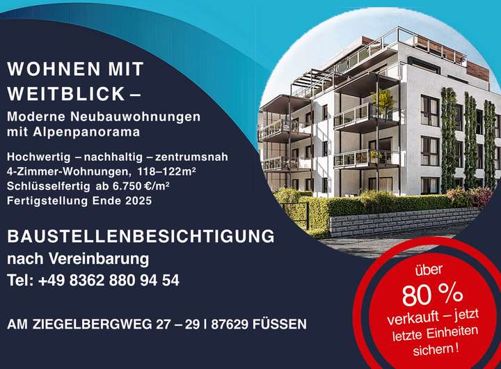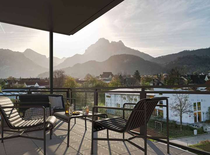 In einer Kombination aus zentraler und doch idyllisch grüner Lage entstehen in Füssen unsere beiden neuesten Mehrfamilienhäuser, erbaut in Massivbauweise. Diese bieten einen atemberaubenden Blick auf das Alpenpanorama und das Schloss Neuschwanstein, sodass Sie von morgens bis abends in den Genuss der Sonne kommen. Jede unserer geräumigen, lichtdurchfluteten Wohnungen zeichnet sich durch großflächige Panoramafenster und großzügige Balkone von bis zu 16 Quadratmetern aus, die eine unvergleichliche Aussicht gewähren.