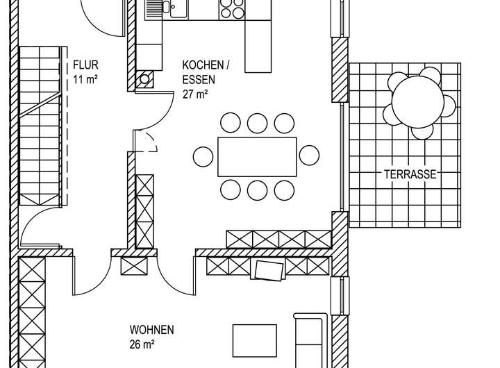 - Wohn-/Essbereich (53 m²) mit offener Küche