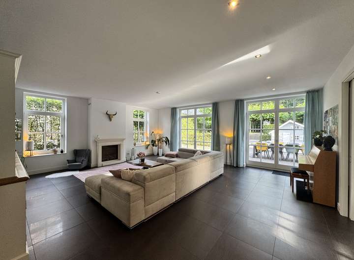 • Großzügiges Wohnzimmer (45 m²) mit Fußbodenheizung, Natursteinboden und elegantem Kamin als Mittelpunkt