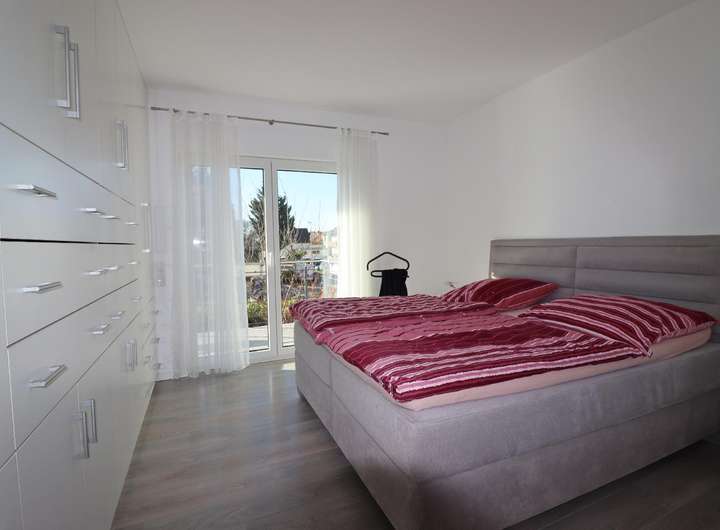 Im Obergeschoss setzt sich der Luxus nahtlos fort. Das großzügige Tageslichtbad mit Dusche und Badewanne bietet einen Ort der Entspannung und Erholung. Das Elternschlafzimmer mit eigenem Ankleideraum und Zugang zum Südwest-Balkon ist ein wahres Refugium. Ein weiteres Schlafzimmer teilt sich diesen Balkon, während ein drittes Schlafzimmer als Master-Schlafzimmer mit eigenem En-Suite-Badezimmer besonderen Komfort bietet. Zusätzlich steht ein viertes Schlafzimmer auf dieser Etage zur Verfügung, das derzeit als Gästezimmer genutzt wird.