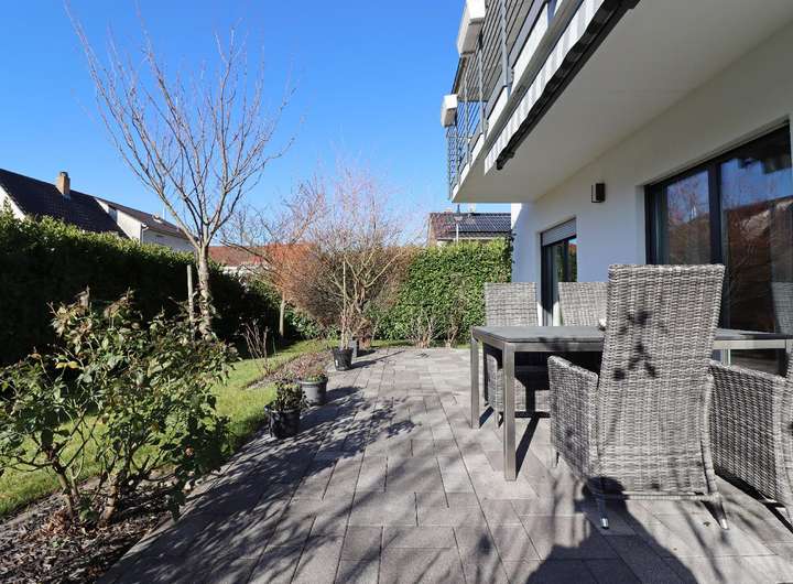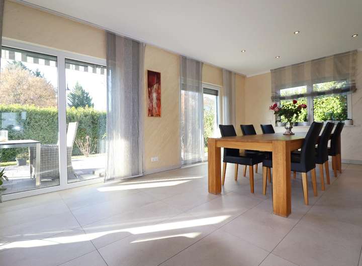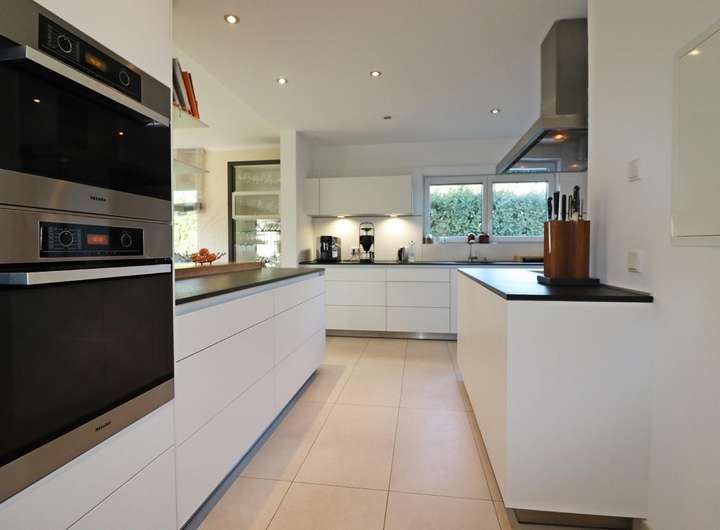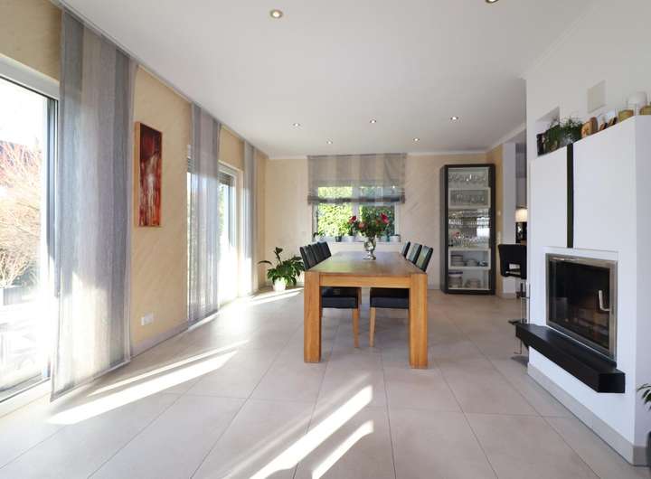 Bereits mit Betreten des Erdgeschosses wird der gehobene Wohnstil spürbar: Die großzügige Diele mit einer Deckenhöhe von über 4 Metern und einem offenen Treppenhaus versprüht ein einladendes und luftiges Ambiente. Die hochwertige BULTHAUP-Küche mit Kochinsel ist ein echtes Highlight und lässt jeden Gast staunen – ein perfekter Ort für kulinarische Erlebnisse. Von der Küche aus hat man einen luftigen Blick in den großzügigen Wohn- und Essbereich, der mit einem eleganten Kamin ausgestattet ist. Vom lichtdurchfluteten Wohn- und Essbereich hat man direkten Zugang zur nach Südwesten ausgerichteten Terrasse. Hier erwartet Sie ein uneinsehbarer Garten, der liebevoll gestaltet wurde und Ihnen maximale Privatsphäre garantiert. Ebenfalls im Erdgeschoss befinden sich ein Büro, eine praktische Garderobe, ein Gäste-WC sowie eine Speisekammer hinter der Küche.
