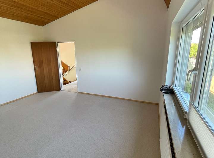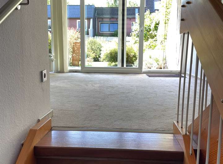 Über die 6 Stufen der zentralen Holztreppe erreicht man das große helle Wohnzimmer mit Glasfront & breiter Glasschiebetür, welche zur überdachten Terrasse führt. Im WZ ist ein hochwertiger 4 Jahre alter heller Teppichboden verlegt.